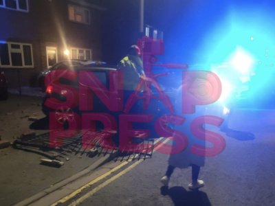 Car crashes through gardens, narrowly missing other vehicles
